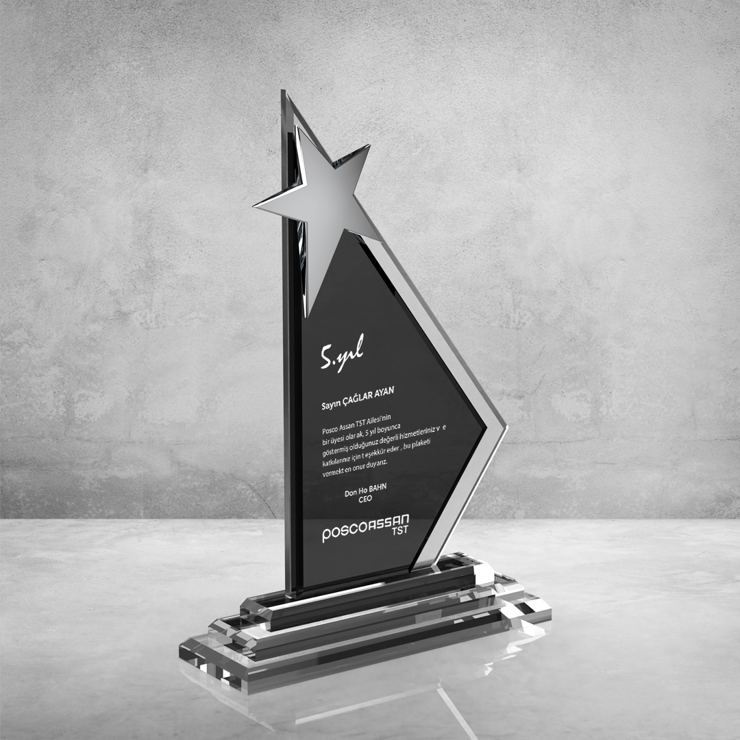 Antalya’nın köklü kurumlarında yıllarını emeğe, sadakate ve zirveye odaklı çalışmaya adamış personelinizi onurlandırmak için tasarlanan Yıldızlı Kıdem Plaketi, 16 mm (1,6 cm) ekstrem cam kalınlığıyla bu uzun yolculuğun kurumsal hafızadaki sarsılmaz yerini temsil ediyor. 26 cm’lik heybetli yüksekliği ve tepesindeki kristal yıldız detayıyla bu ödül, kıdemin sadece bir zaman dilimi değil, parlayan bir başarı hikayesi olduğunu simgeler.